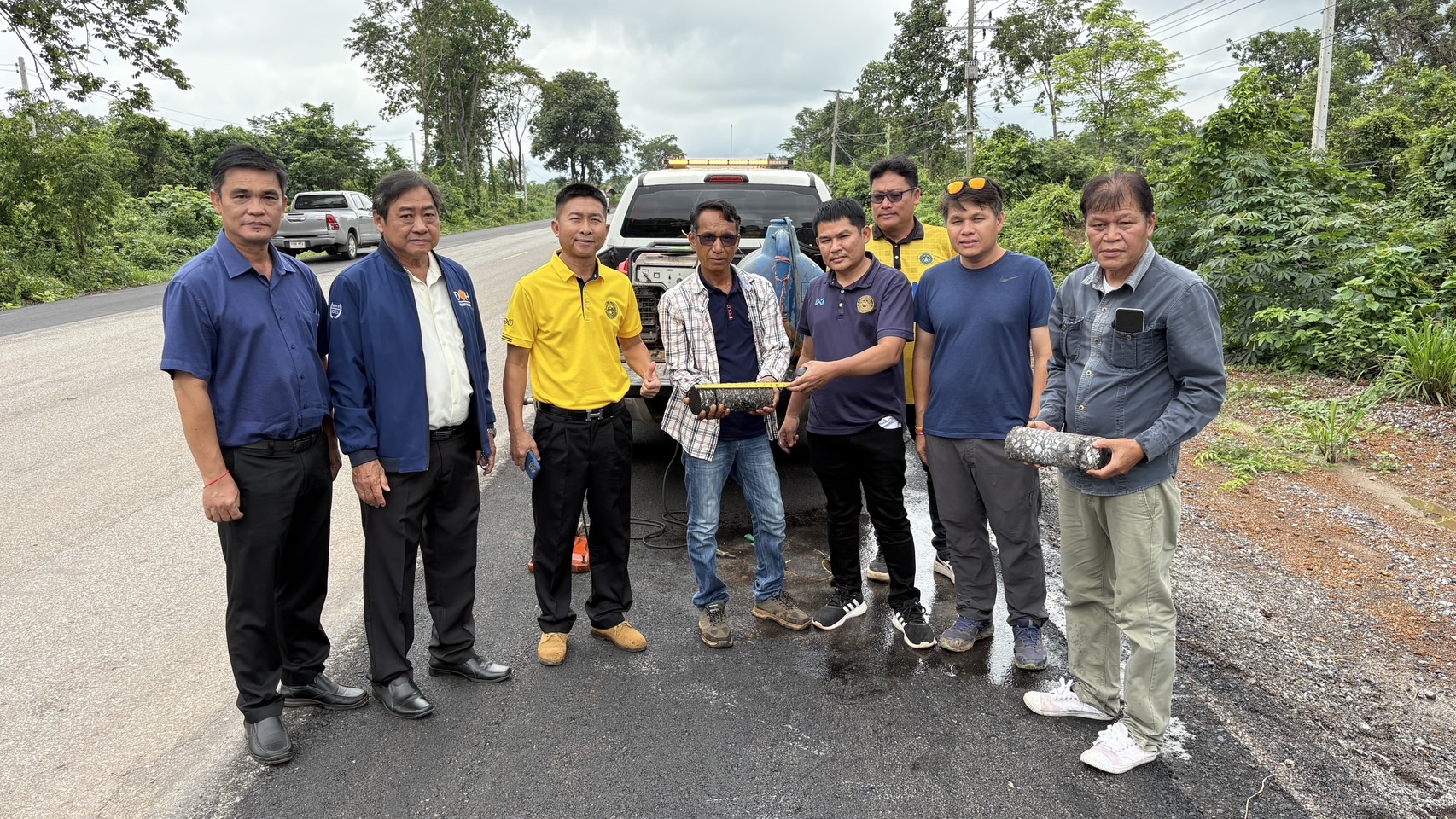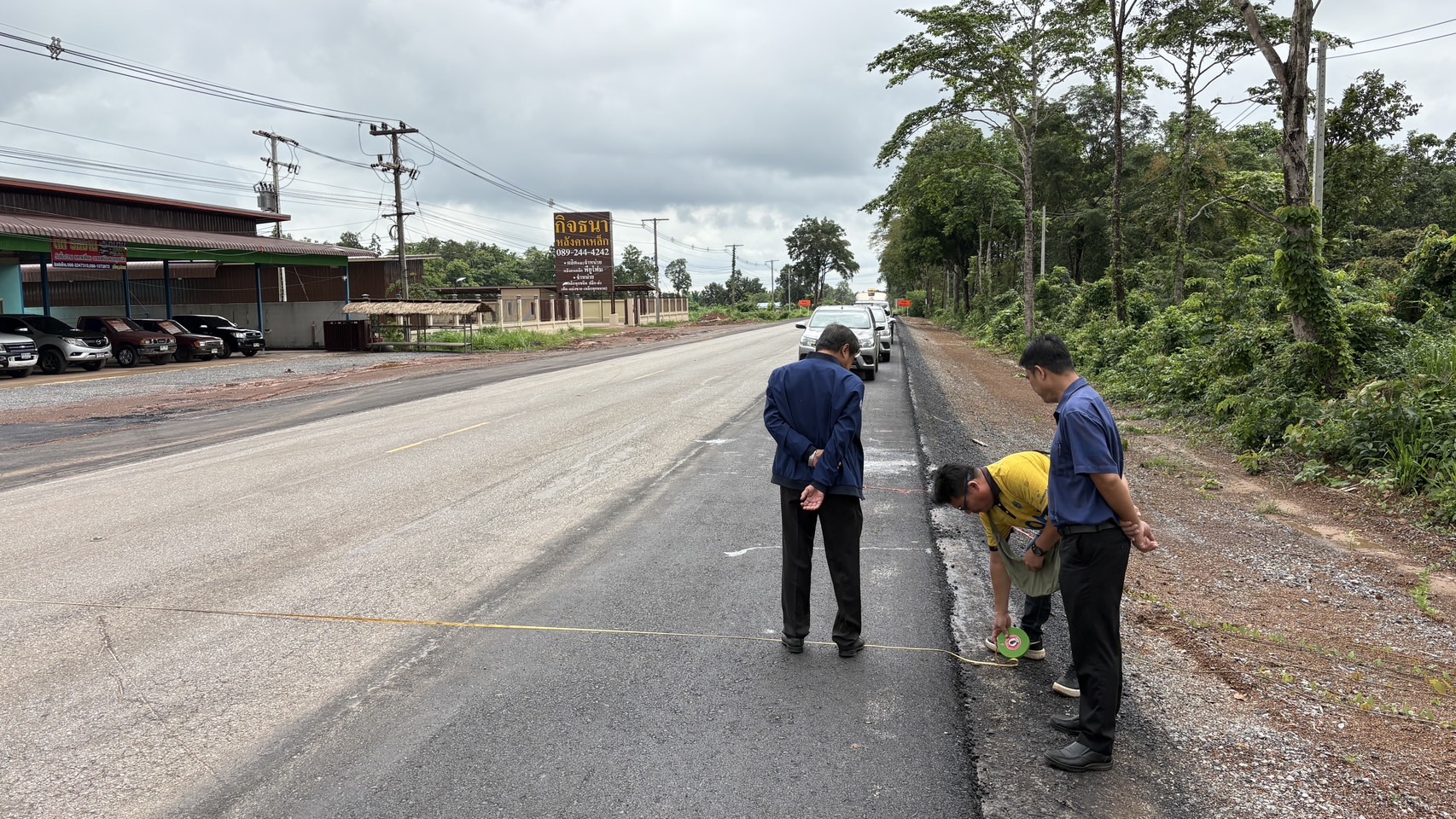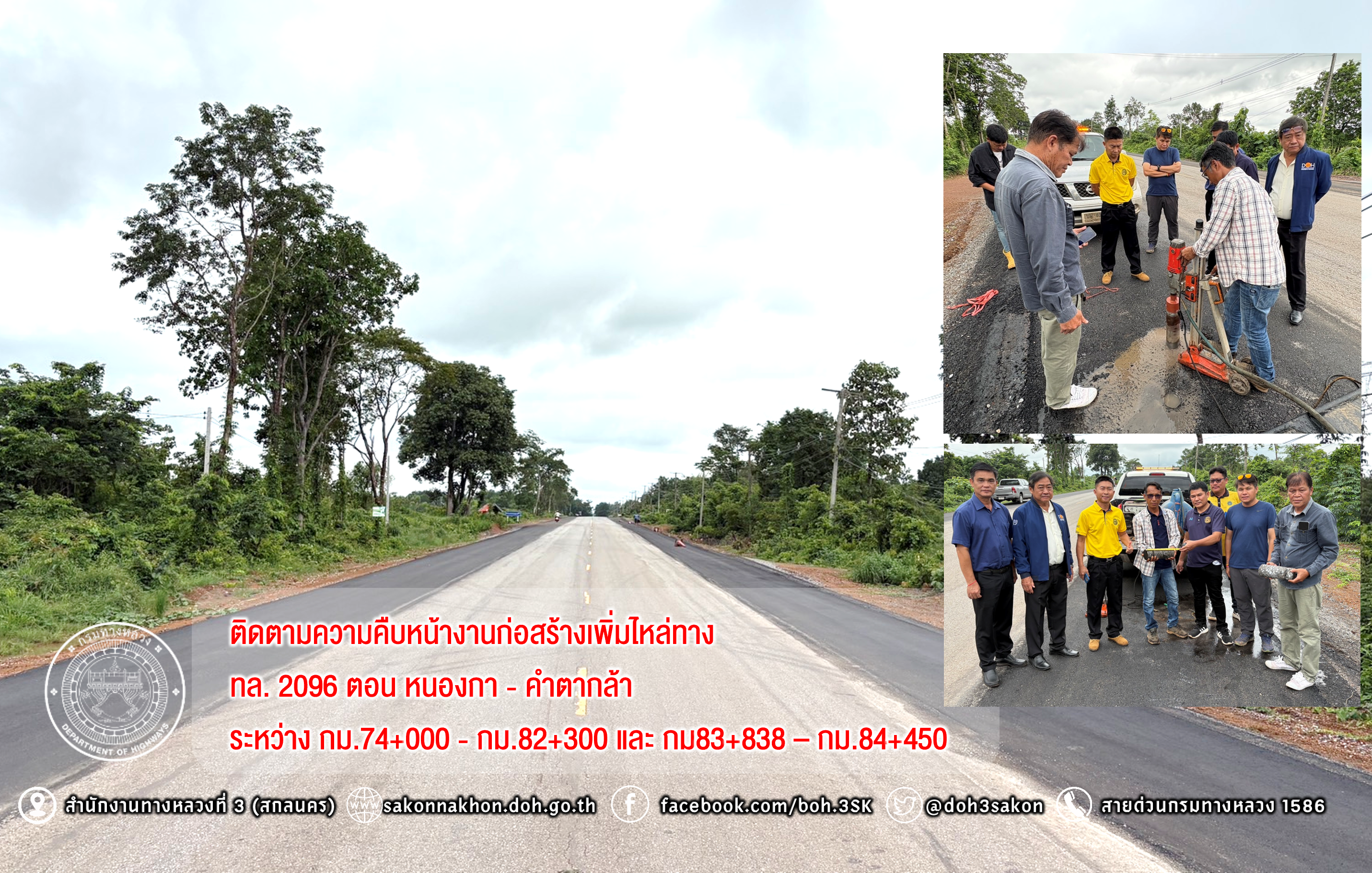 วันที่ 23 มิถุนายน 2568 เวลา10.00น.นายชัยธวัช พรหมวิชัย ผู้อำนวยการสำนักงานทางหลวงที่ 3 ประธานคณะกรรมการตรวจรับพัสดุ พร้อมด้วย คณะกรรมการตรวจรับพัสดุ ลงพื้นที่ติดตามความคืบหน้างานก่อสร้างเพิ่มไหล่ทาง ทางหลวงหมายเลข 2096 ตอน หนองกา - คำตากล้า ระหว่าง กม.74+000 - กม.82+300 และ กม83+838 – กม.84+450 ปริมาณ 2 แห่ง (9.367 กม.) วงเงิน 78,692,000 บาท มีห้างหุ้นส่วนจำกัด เมืองทองคำตากล้า เป็นผู้รับจ้าง (ตรวจรับงานงวดที่ 2) เพื่อให้ได้ตามแบบมาตรฐานของกรมทางหลวง พร้อมให้คำแนะนำแก้ไขปัญหาและอุปสรรคในการก่อสร้างฯ ควบคุมการก่อสร้างโดยนายณัฐชาติ นันทะมาตย์ วิศวกรโยธาปฏิบัติการ ผู้ควบคุมงานก่อสร้าง ส่วนควบคุมงานก่อสร้างทาง สำนักงานทางหลวงที่ 3 (สกลนคร)