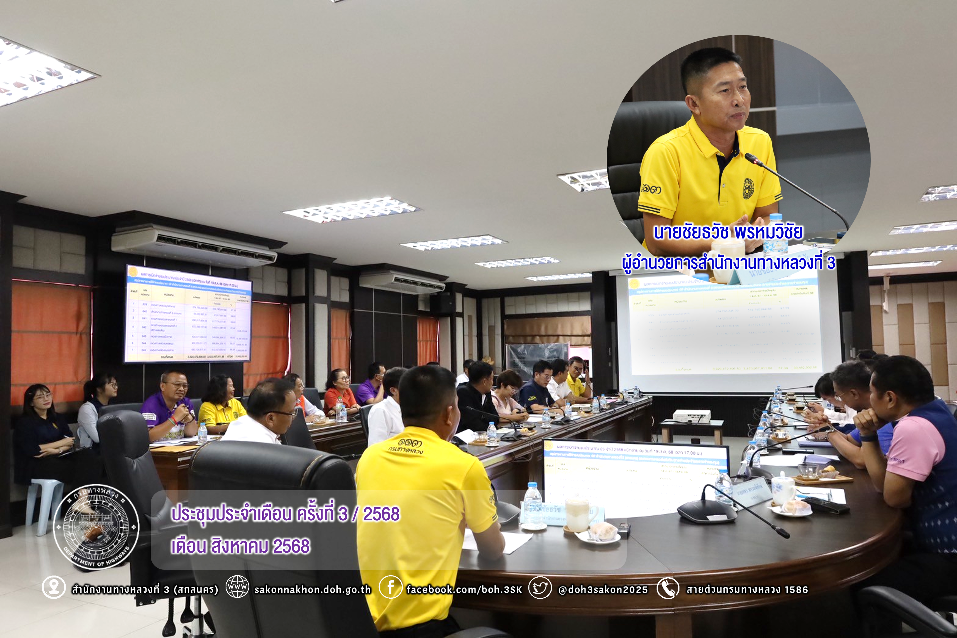 วันที่ 20 สิงหาคม 2568 เวลา 14.00น.นายชัยธวัช พรหมวิชัย ผู้อำนวยการสำนักงานทางหลวงที่ 3 พร้อมด้วย นายประวัติ เสวตวงษ์ รองผู้อำนวยการสำนักงานทางหลวงที่ 3, นายเดชา พรวนพิทักษ์ รองผู้อำนวยการสำนักงานทางหลวงที่ 3 ตำแหน่งที่ 1, นายประวัติ เสวตวงษ์ รองผู้อำนวยการสำนักงานทางหลวงที่ 3 ตำแหน่งที่ 2, ผู้อำนวยการแขวงทางหลวงในสังกัด,รองผู้อำนวยการแขวงทางหลวงในสังกัด, ผู้อำนวยการส่วน/ฝ่าย/งาน และเจ้าหน้าที่ที่เกี่ยวข้อง ได้เข้าร่วมประชุมประจำเดือน ครั้งที่ 3/2568 เพื่อติดตามงานและติดตามผลการเบิกจ่ายงบประมาณปี 2568 ณ ห้องประชุมทวีพัฒน์ ตินะมาส ชั้น 3 อาคารหลังใหม่