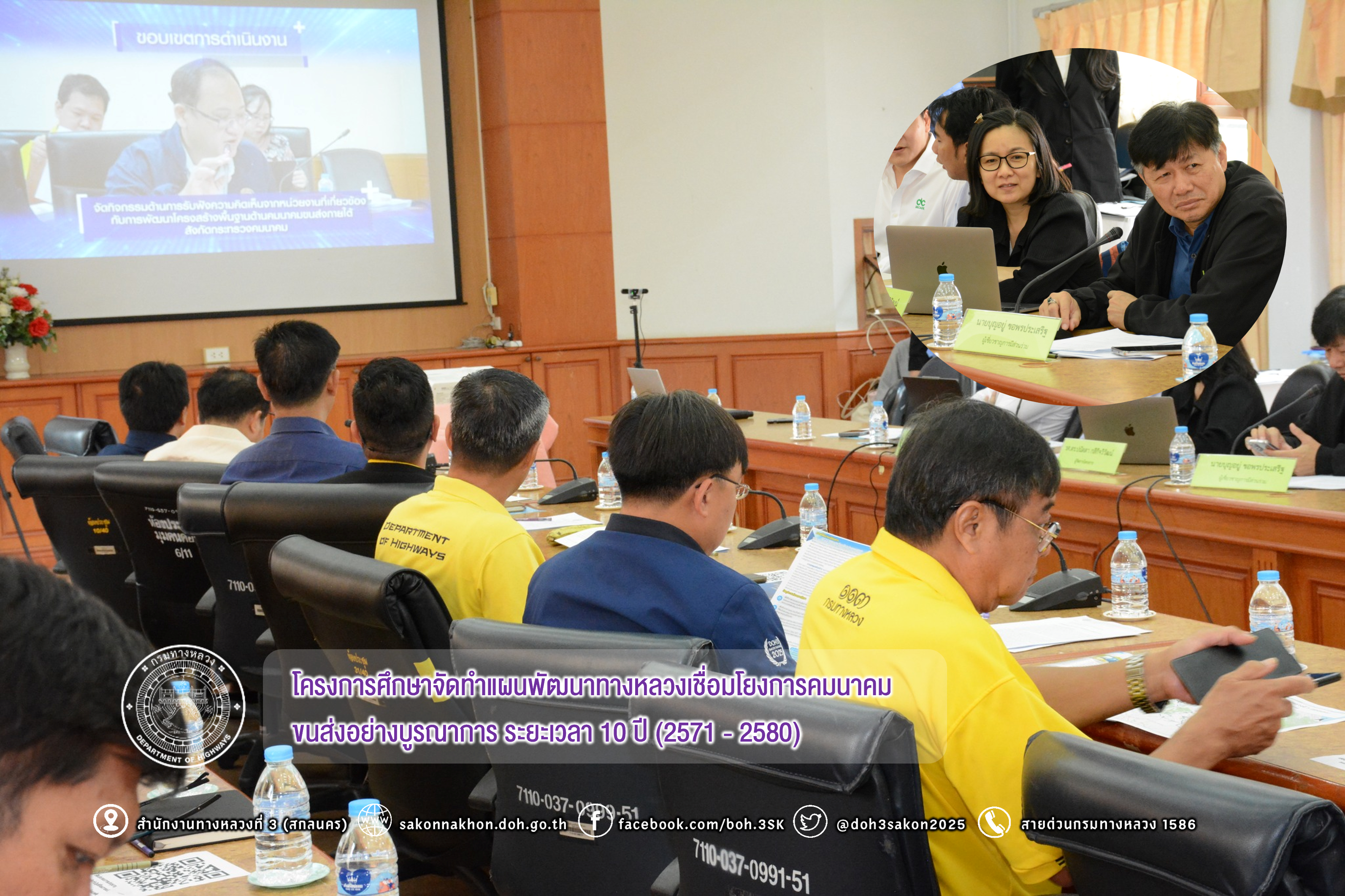 วันที่ 3 กันยายน 2568 เวลา 09.00 - 16.00 น.นายชัยธวัช พรหมวิชัย ผู้อำนวยการสำนักงานทางหลวงที่ 3 พร้อมด้วย นายประวัติ เสวตวงษ์ รองผู้อำนวยการสำนักงานทางหลวงที่ 3, ผู้อำนวยการส่วนแผนงาน, ส่วนสำรวจและออกแบบ, ส่วนตรวจสอบและวิเคราะห์ทางวิศวกรรม, ส่วนอำนวยความปลอดภัย, ส่วนควบคุมงานก่อสร้างทาง, แขวงทางหลวงในสังกัดฯ และเจ้าหน้าที่ที่เกี่ยวข้อง ได้เข้าร่วมประชุมประชุมกลุ่มย่อยการจัดทำบัญชีโครงการเบื้องต้น (Longlist) โครงการศึกษาจัดทำแผนพัฒนาทางหลวงเชื่อมโยงการคมนาคมขนส่งอย่างบูรณาการ ระยะเวลา 10 ปี (2571 - 2580) ณ ห้องประชุมศาลาบุญธาริน สำนักงานทางหลวงที่ 3 (สกลนคร)