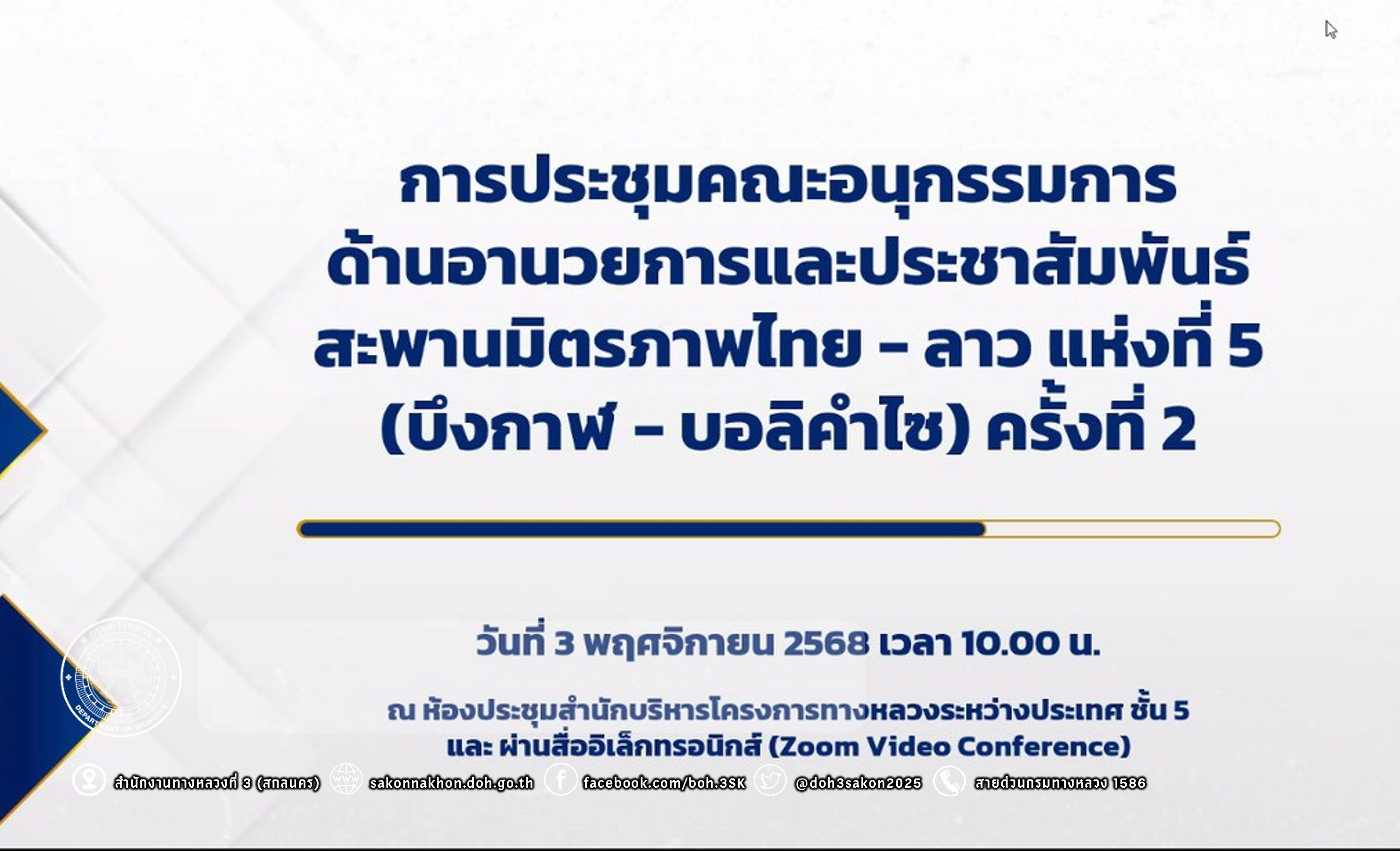 วันที่ 3 พฤศจิกายน 2568 เวลา 10.00 น. นายชัยธวัช พรหมวิชัย ผู้อำนวยการสำนักงานทางหลวงที่ 3 พร้อมด้วย นายเดชา พรวนพิทักษ์ รองผู้อำนวยการสำนักงานทางหลวงที่ 3 ตำแหน่งที่ 1, นายประวัติ เสวตวงษ์ รองผู้อำนวยการสำนักงานทางหลวงที่ 3 ตำแหน่งที่ 2 ,นางนภาพิศ สุวรรณศรี ผู้อำนวยการส่วนบริหาร,นายชินนพัทธ์ มุลทาทอง ผู้อำนวยการส่วนแผนงาน, นายหนูกาญ เจริญไชย ผู้อำนวยการส่วนกฎหมายและกรรมสิทธิ์ที่ดิน, นิติกร และวิศวกรโยธา ส่วนแผนงาน ได้เข้าร่วมประชุมคณะอนุกรรมการด้านอำนวยการและประชาสัมพันธ์สะพานมิตรภาพไทย - ลาว แห่งที่ 5 (บึงกาฬ - บอลิคำไซ) ครั้งที่ 2 ผ่านสื่ออิเล็กทรอนิกส์ (Zoom Video Conference) ณ ห้องประชุมทวีพัฒน์ ตินะมาส ชั้น 3 โดยมี นายธันวิน สวัสดิศานต์ ผู้อำนวยการสำนักบริหารโครงการทางหลวงระหว่างประเทศ เป็นประธานฯ