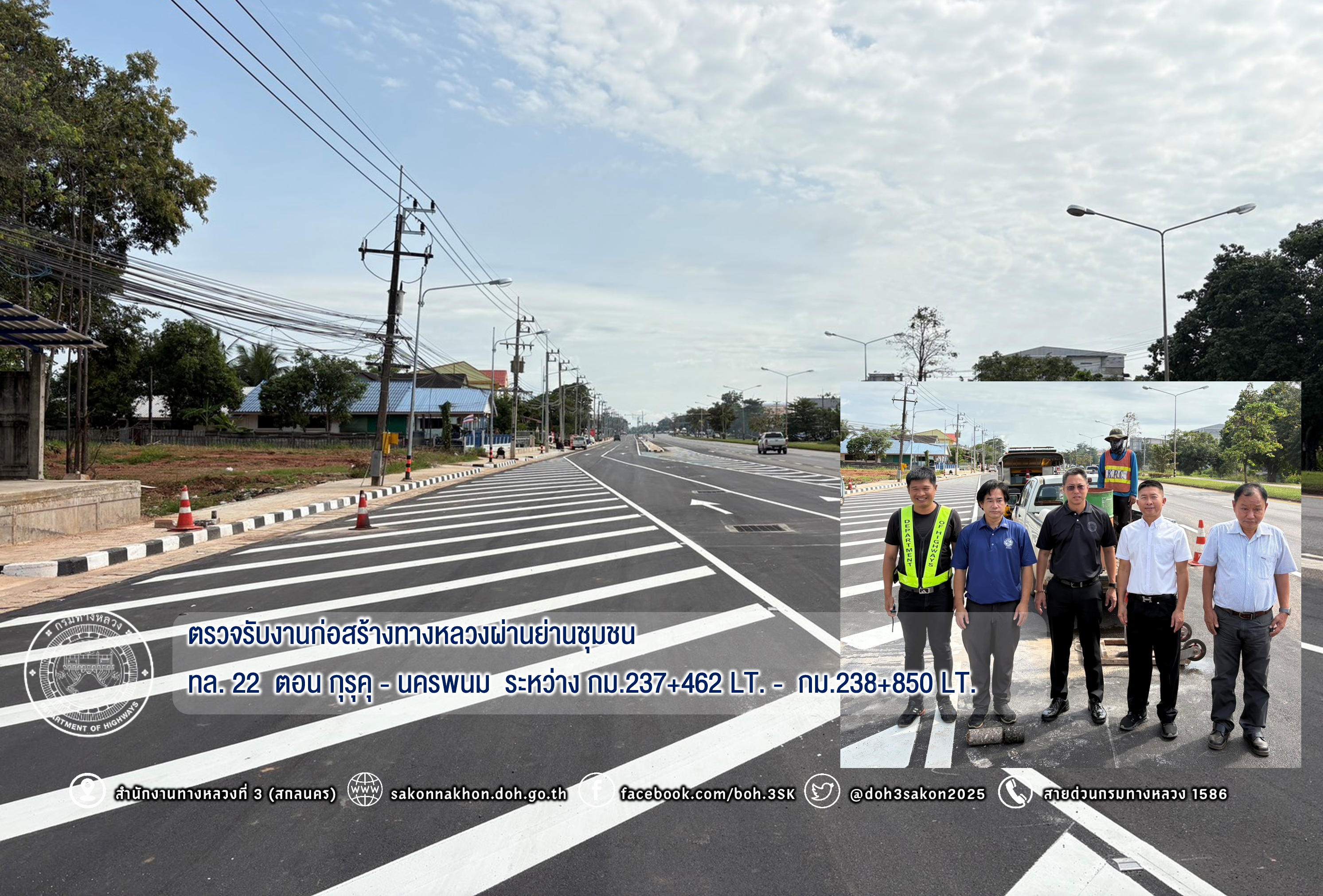 พร้อมด้วยนายพิชญ รุ่งเรืองวิโรจน์ ผู้อำนวยการแขวงทางหลวงนครพนม และคณะกรรมการตรวจรับพัสดุ ลงพื้นที่ตรวจรับงานก่อสร้างทางหลวงผ่านย่านชุมชน ทางหลวงหมายเลข 22 ตอน กุรุคุ - นครพนม ระหว่าง กม.237+462 LT. - กม.238+850 LT. ปริมาณงาน 1 แห่ง (3.388 กม.) วงเงิน 59,990,000 บาท มีบริษัท เค.อาร์.ซี.เอ็นจีเนียริ่ง จำกัด เป็นผู้รับจ้าง เพื่อให้ได้ตามแบบมาตรฐานของกรมทางหลวง