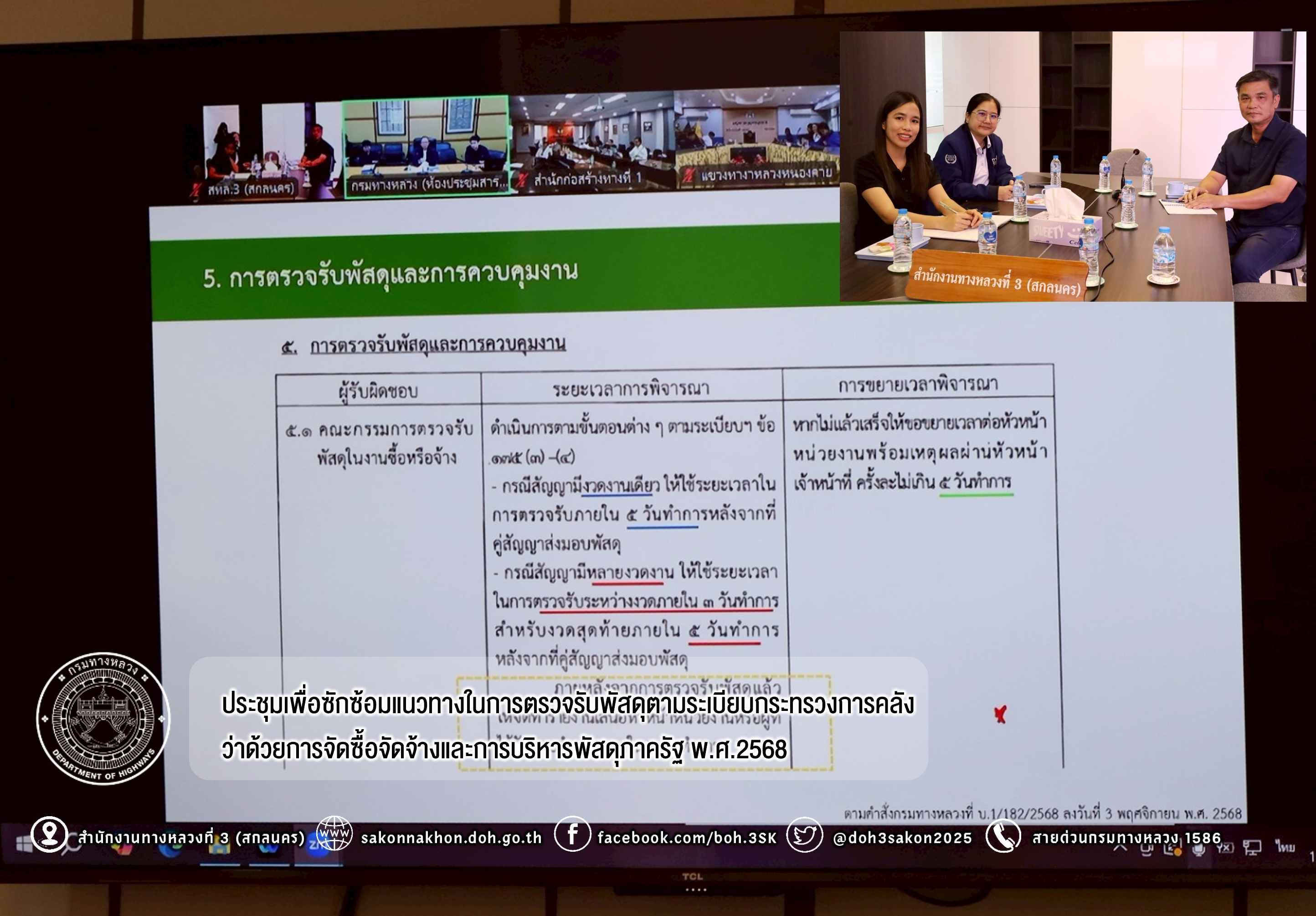วันที่ 13 พฤศจิกายน 2567 เวลา 13.30 น.นายปัญญา พึ่งประจวบ ผู้อำนวยการส่วนอำนวยความปลอดภัย พร้อมด้วย เจ้าหน้าที่ส่วนกฎหมายและกรรมสิทธิ์ที่ดิน และเจ้าหน้าที่งานพัสดุและสัญญา ได้รับมอบหมายจาก ผู้อำนวยการสำนักงานทางหลวงที่ 3 ให้เข้าร่วมประชุมเพื่อซักซ้อมแนวทางในการตรวจรับพัสดุตามระเบียบกระทรวงการคลัง ว่าด้วยการจัดซื้อจัดจ้างและการบริหารพัสดุภาครัฐ พ.ศ.2568 ผ่านสื่ออิเล็กทรอนิกส์แอปพลิเคชั่น Zoom Cloud Meeting ณ ห้องประชุมชั้น 2 อาคารหลังใหม่ สำนักงานทางหลวงที่ 3 (สกลนคร)