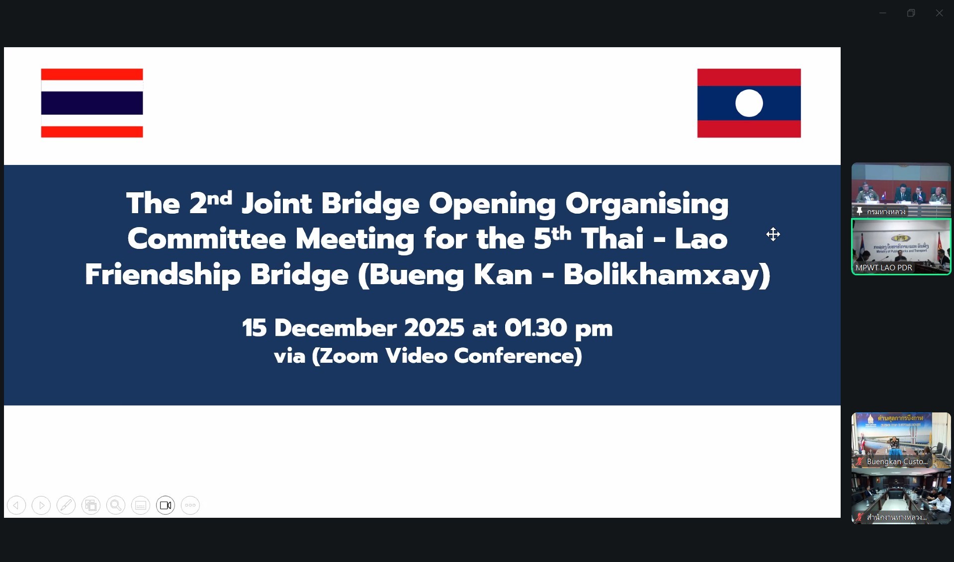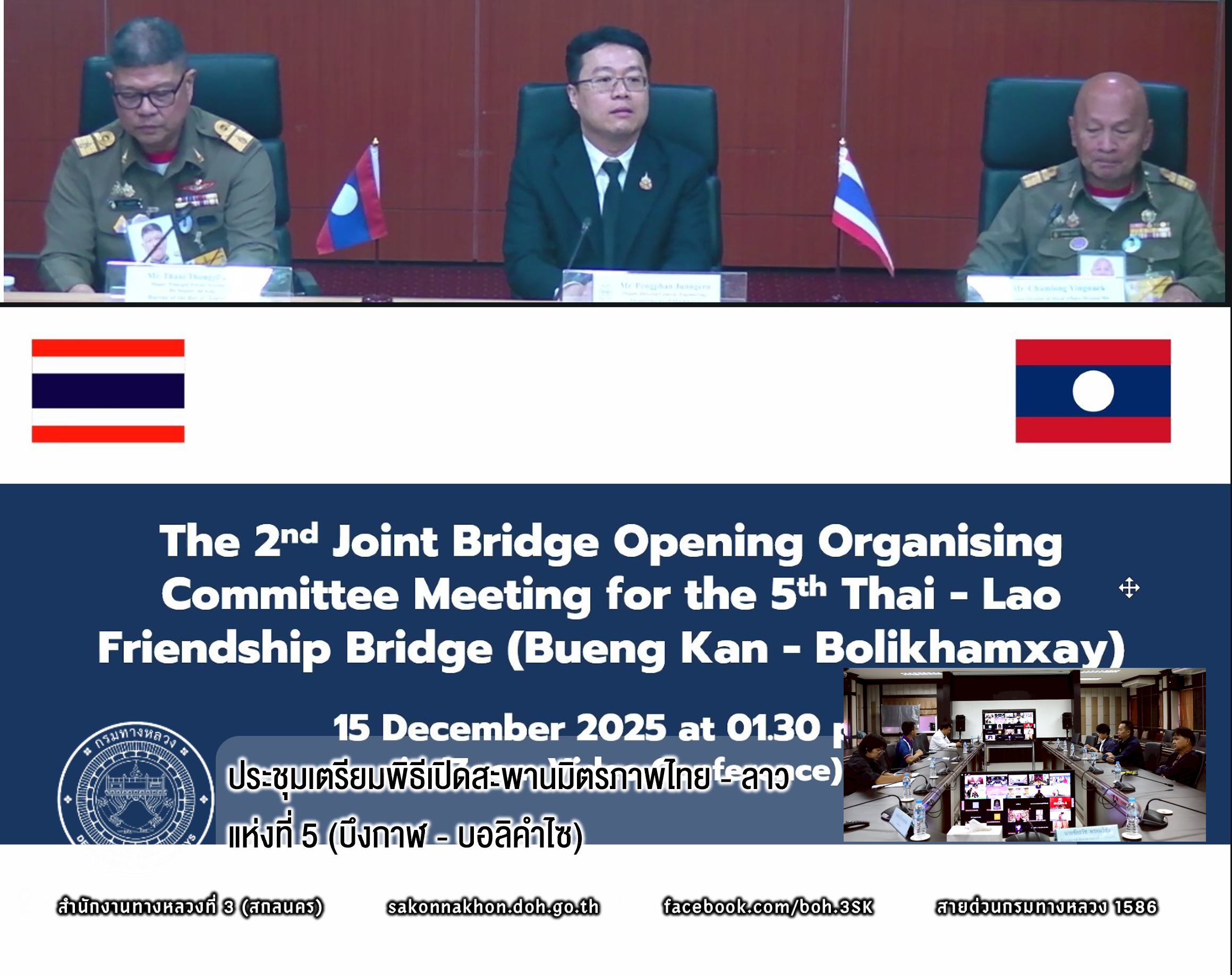 วันที่ 15 ธันวาคม 2568 เวลา 13.30 น. นางนภาพิศ สุวรรณศรี ผู้อำนวยการส่วนบริหาร พร้อมด้วย นายหนูกาญ เจริญไชย ผู้อำนวยการส่วนกฎหมายและกรรมสิทธิ์ที่ดิน และนิติกร ส่วนกฎหมายฯ / วิศวกรโยธา ,นายช่างโยธา ส่วนแผนงานและส่วนอำนวยความปลอดภัย ได้รับมอบหมายจาก ผู้อำนวยการสำนักงานทางหลวงที่ 3 ให้เข้าร่วมประชุมคณะกรรมการดำเนินงานจัดเตรียมพิธีเปิดสะพานมิตรภาพไทย - ลาว แห่งที่ 5 (บึงกาฬ - บอลิคำไซ) พร้อมเปิดด่านพรมแดน ฝั่งไทย (ร่วมไทย - ลาว) ครั้งที่ 2 เพื่อติดตามความคืบหน้าในการประสานเรื่องที่เกี่ยวข้องกับการจัดพิธีฯ ของฝ่ายไทยและลาว ผ่านสื่ออิเล็กทรอนิกส์ (Zoom Video Conference) ณ ห้องประชุมทวีพัฒน์ ตินะมาส ชั้น 3 โดยมี นายพงษ์พันธ์ จั่นเงิน รองอธิบดีฝ่ายวิชาการ เป็นประธานฝ่ายไทย