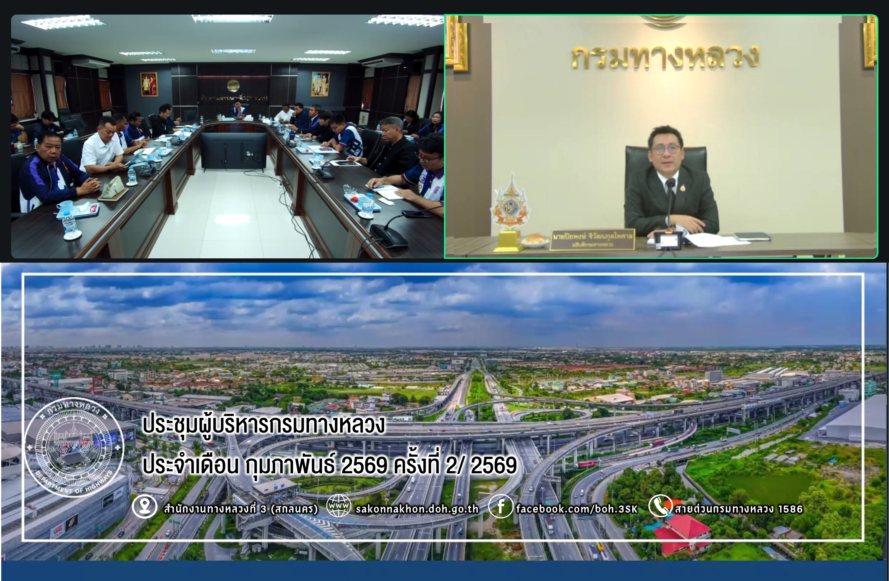 นายชัยธวัช พรหมวิชัย ผู้อำนวยการสำนักงานทางหลวงที่ 3 พร้อมด้วย คณะผู้บริหาร/เจ้าหน้าที่ ในสังกัดฯ ได้เข้าร่วมประชุมผู้บริหารกรมทางหลวง ประจำเดือน กุมภาพันธ์ 2569 ครั้งที่ 2/2569 เพื่อรับทราบและติดตามการดำเนินงานในประเด็นสำคัญ ดังนี้: